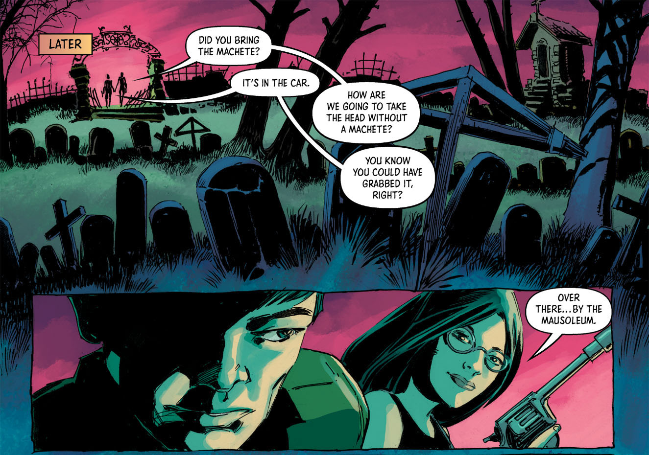 This introductory graphic novel builds the world out effectively, though it also feels a little cramped. While I appreciate leaving backstory as seasoning, not the stock, there’s so much Niles and Denton toss out in quick exposition that it feels like they had to compress a mini-series down. There’s 20 pounds of fun horror stuffed into a 10 pound bag. Then again, that just leaves room for a prequel graphic novel without it having to bog down in direct connection.
