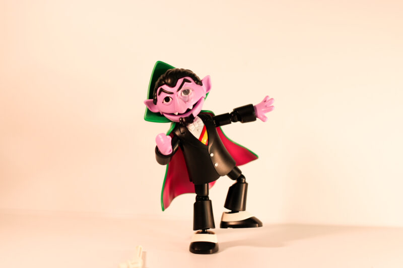 Each figure does come with an iconic accessory. For Oscar, admittedly my favorite, he comes with his iconic garbage can, with a lid that can either be open on the can itself or placed on Oscar’s head as a jaunty trash-hat. Bert comes with a pigeon, Ernie comes with his rubber ducky. The count comes with a fantastic little cape. And new to series 2, each character comes with a small, white control rod that can be used to move the character’s mouth. We will get into that more in a bit.