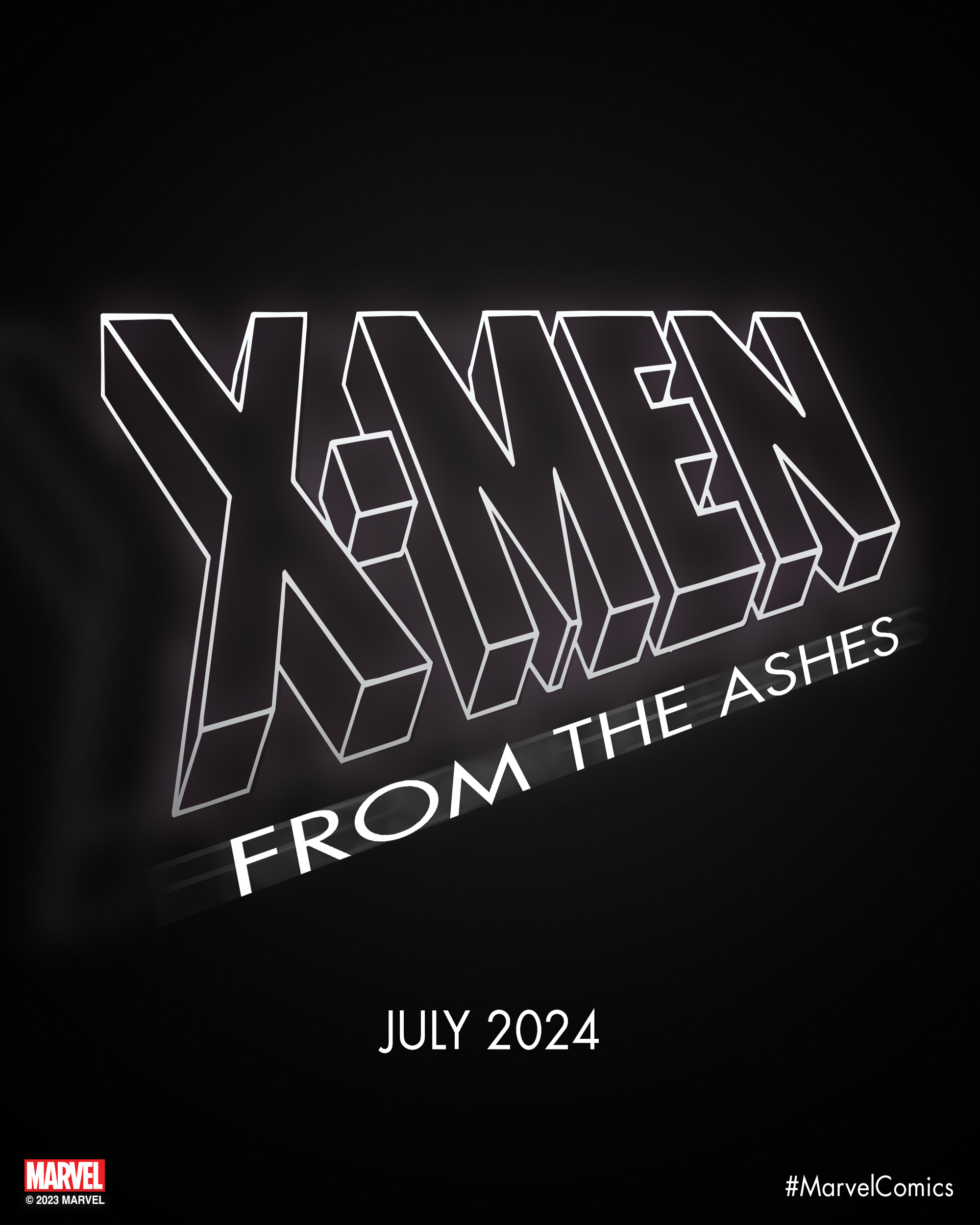 The press release simply says “…following the end of the Krakoa era, new X-MEN ongoing titles launch in July 2024.” Accompanying that is a stark black and white graphic that says “From the ashes.”